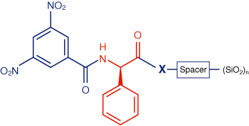 As a chiral selector for NUCLEOSIL® Chiral-2, dinitrobenzoyl-D-phenylglycine is covalently bonded to silica gel via a spacer, the optical antipode dinitrobenzoyl-L-phenylglycine is used for NUCLEOSIL® Chiral-3.