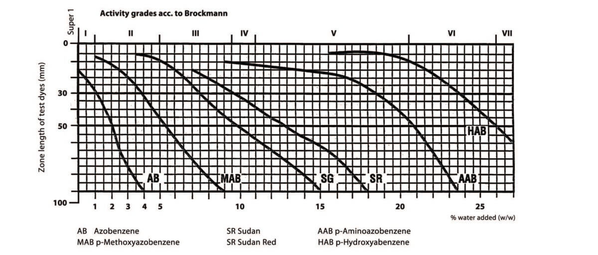 Sorbent Technologies’ standardized aluminas are based on a deactivation scale (see chart). Alumina Super I is standardized to such a high degree that all three surface types of aluminas, (acid, basic, neutral) show an identical initial activity, and when deactivated with equal amounts of deactivator (e.g., water), they reach the same lower activity status. The percent of water addition is based upon weight/weight relationships. Activity level is according to Brockmann/Schodder.
