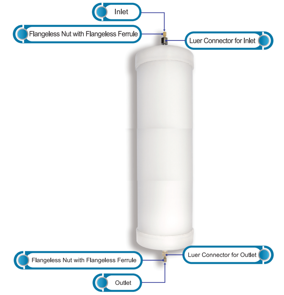 3. Install the Luer Connector for Inlet at the inlet of the column. This can be installed by hand and needs to be screwed in manually. Install the Flangeless Nut with Flangeless Ferrule on it.