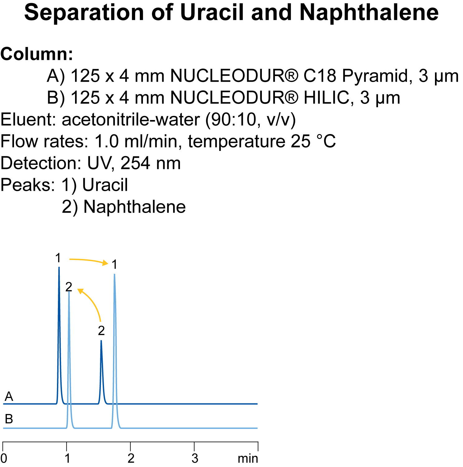 Nonpolar compounds exhibit faster elution profiles due to minor hydrophobic interactions. As shown for the separation of uracil and naphthalene the elution order is quite often inverse on HILIC columns compared to RP columns.