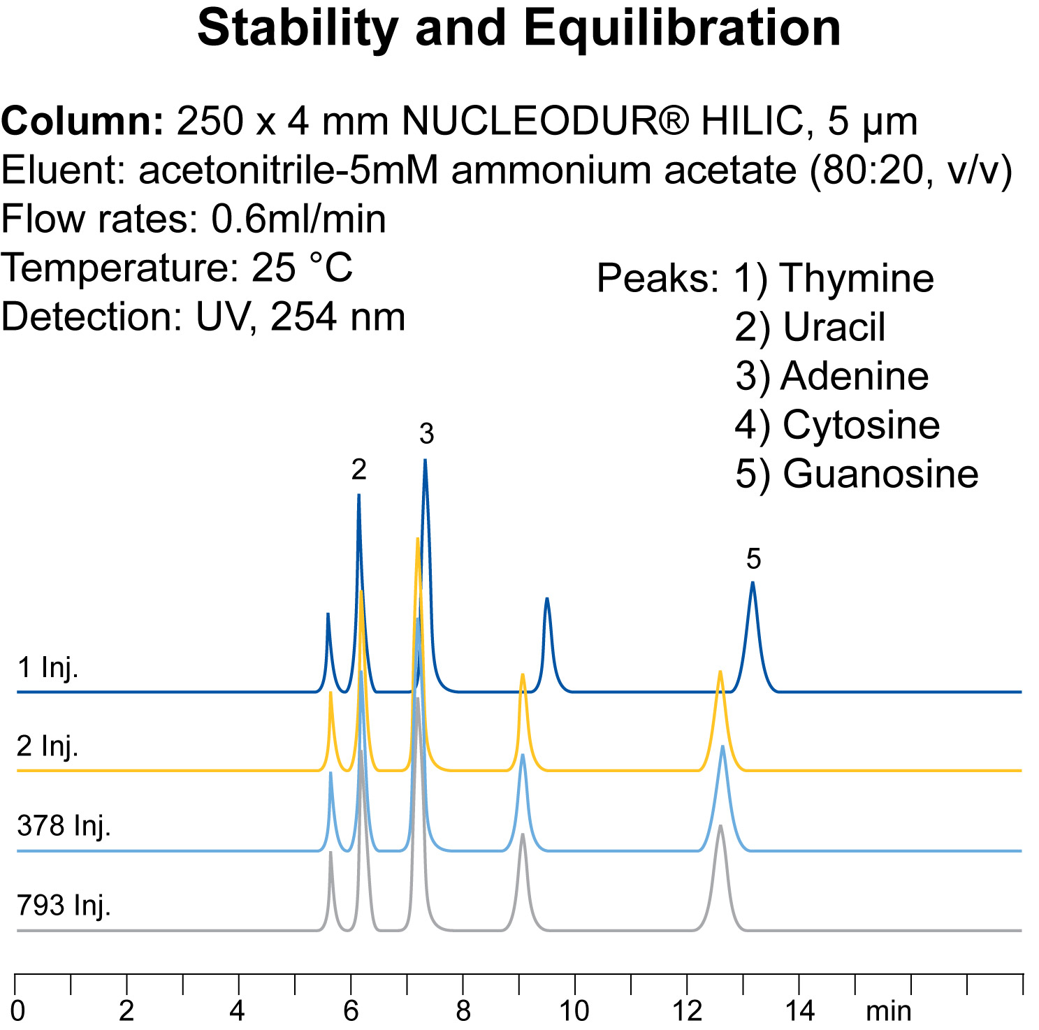 Due to an advanced and unique surface modification procedure (pat. pend.) NUCLEODUR HILIC columns provide short equilibration times-after just 20 min equilibration already the 2nd injection shows stable and reproducible results.