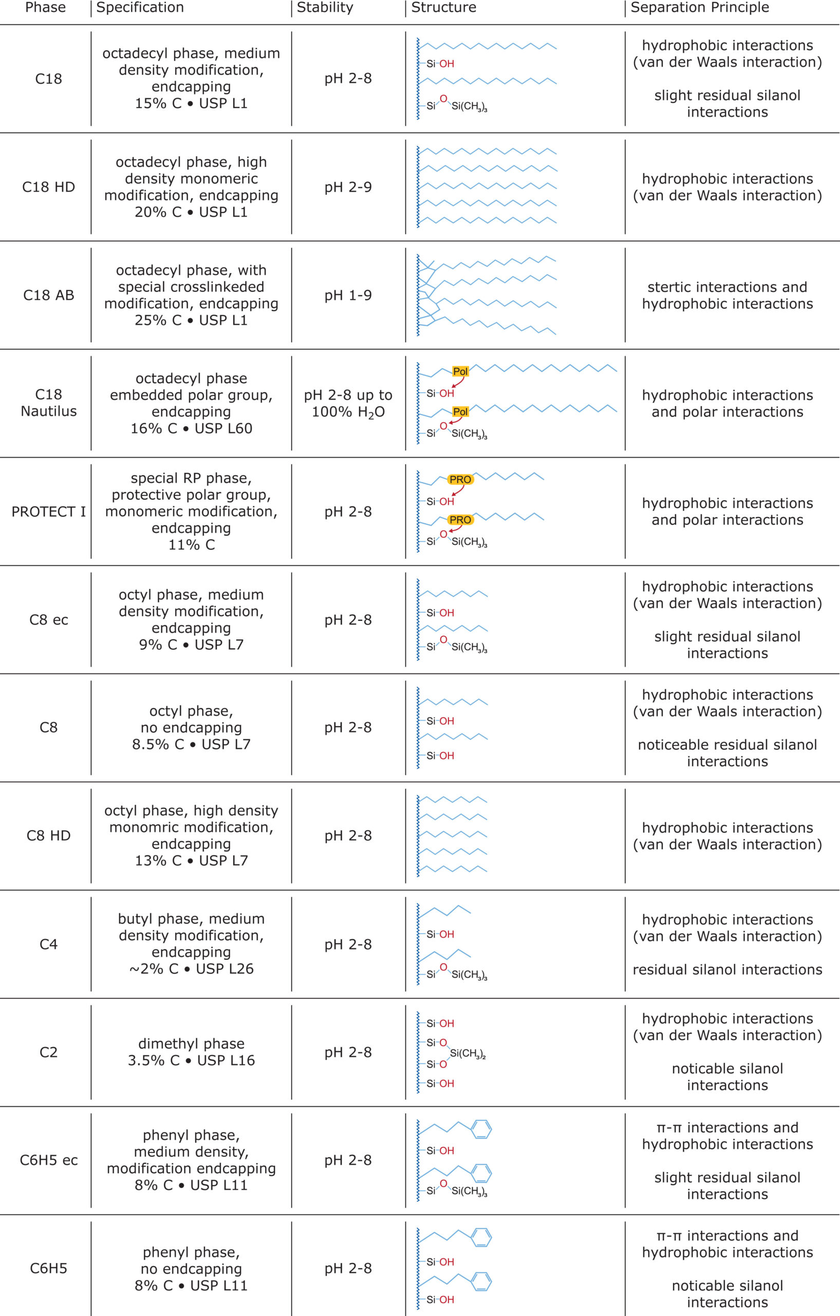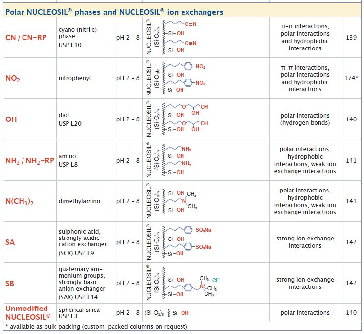 The silica is manufactured with different pore diameters (50, 100, 120, 300, 500, 1000, and 4000 Å) and particle sizes from 3 µm (only Nucleosil 50, 100 and 120) to 10 µm with very narrow fractionation.