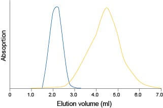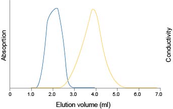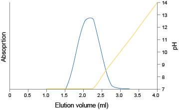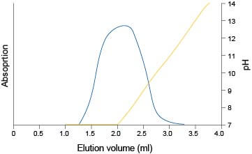 | Removal of Ammonia (33%) Dextran Blue (260nm): dark blue line NH3 (pH): gold line 0.5 mg Dextran Blue (Mr 2,000,000) in 1 mL ammonia (33%) Water elution |