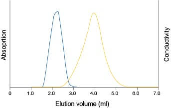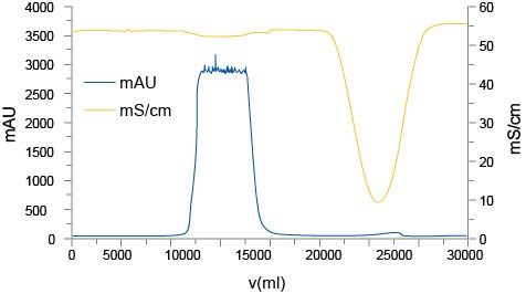 | Protein Desalting from 0.8M NaCl IgG (280nm): dark blue line NaCl (µS): gold line 1 mg IgG anti-Rabbit in 1 mL 0.8 M sodium chloride Water elution |