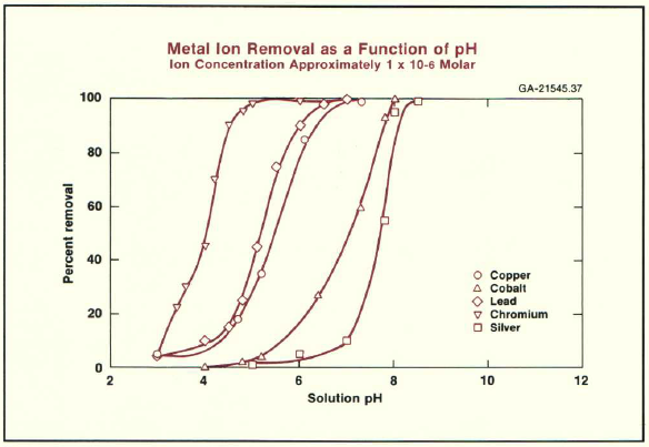 The figure above presents data from Alcoa Labs in New Kensington, PA, illustrating how activated alumina removes metal ions at different pH levels. Researchers gathered this information under dilute solution conditions, using 1 gram per liter of solids and 1 micromolar metal ion concentrations.